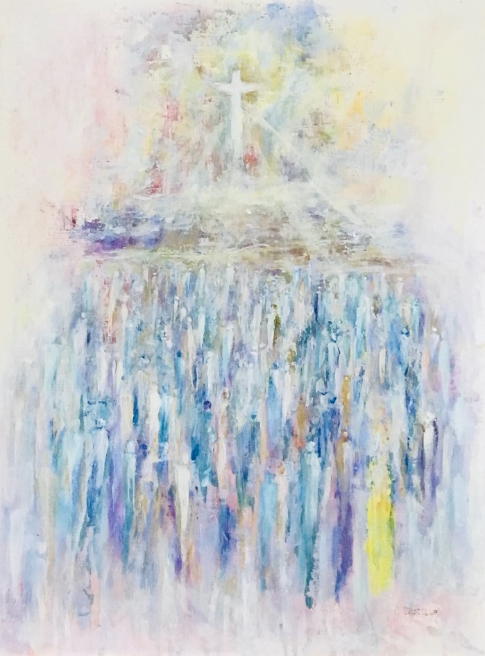 This painting can fit in a standard 12″ x 16″ size frame without a mat or in a 16″ x 20″ with frame.